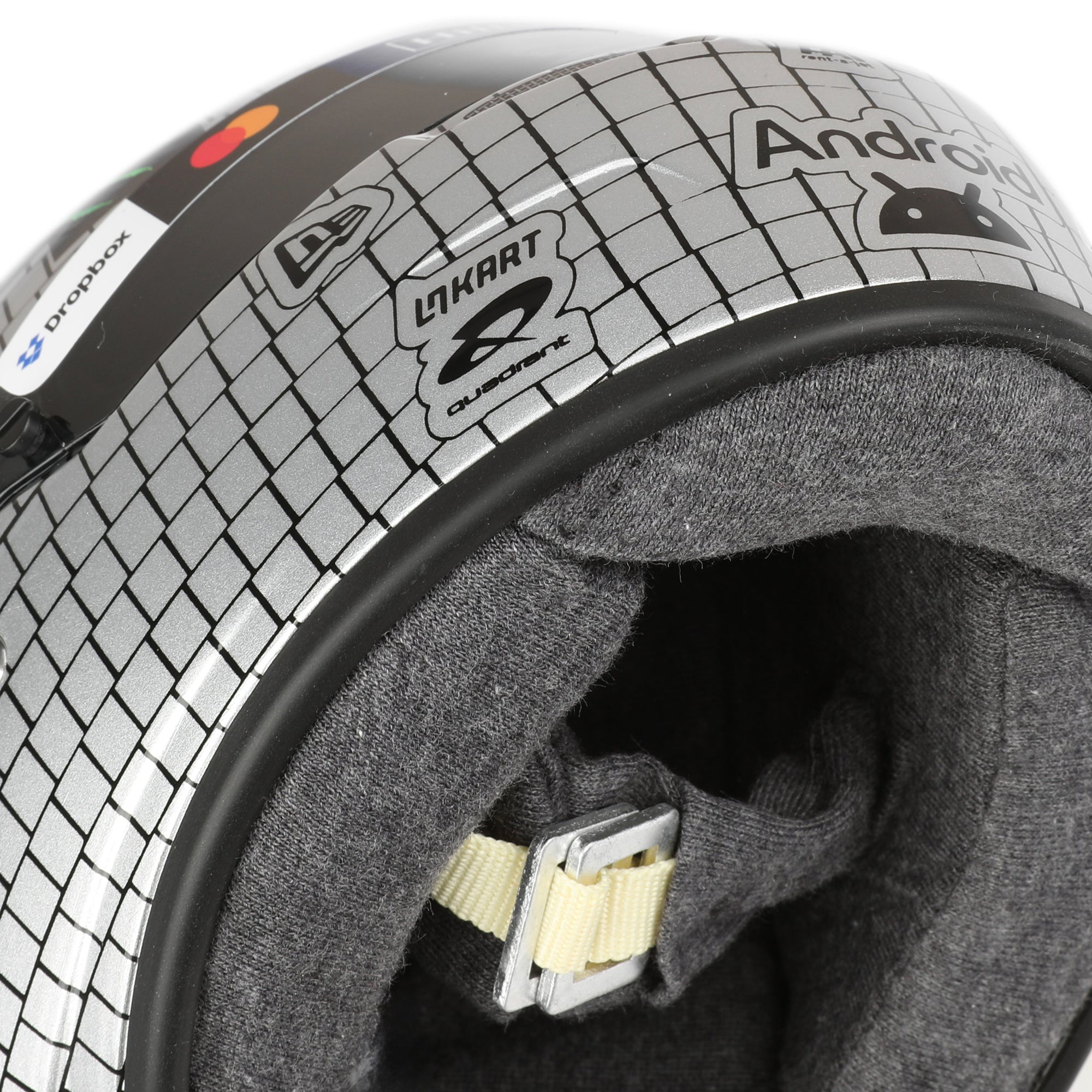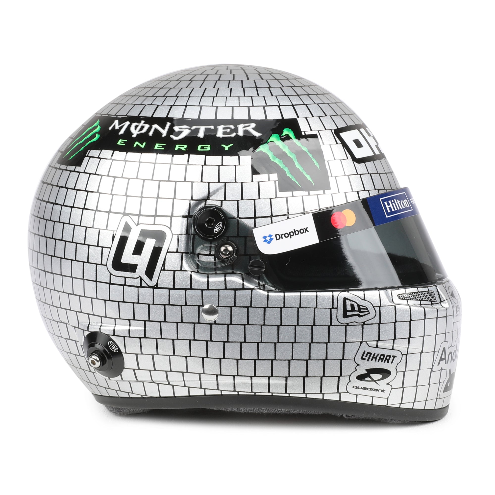 Please note: The metallic finish on these half scale helmets may differ to Norris’ full scale chrome helmet, and finer details such as sponsor logos may also vary.