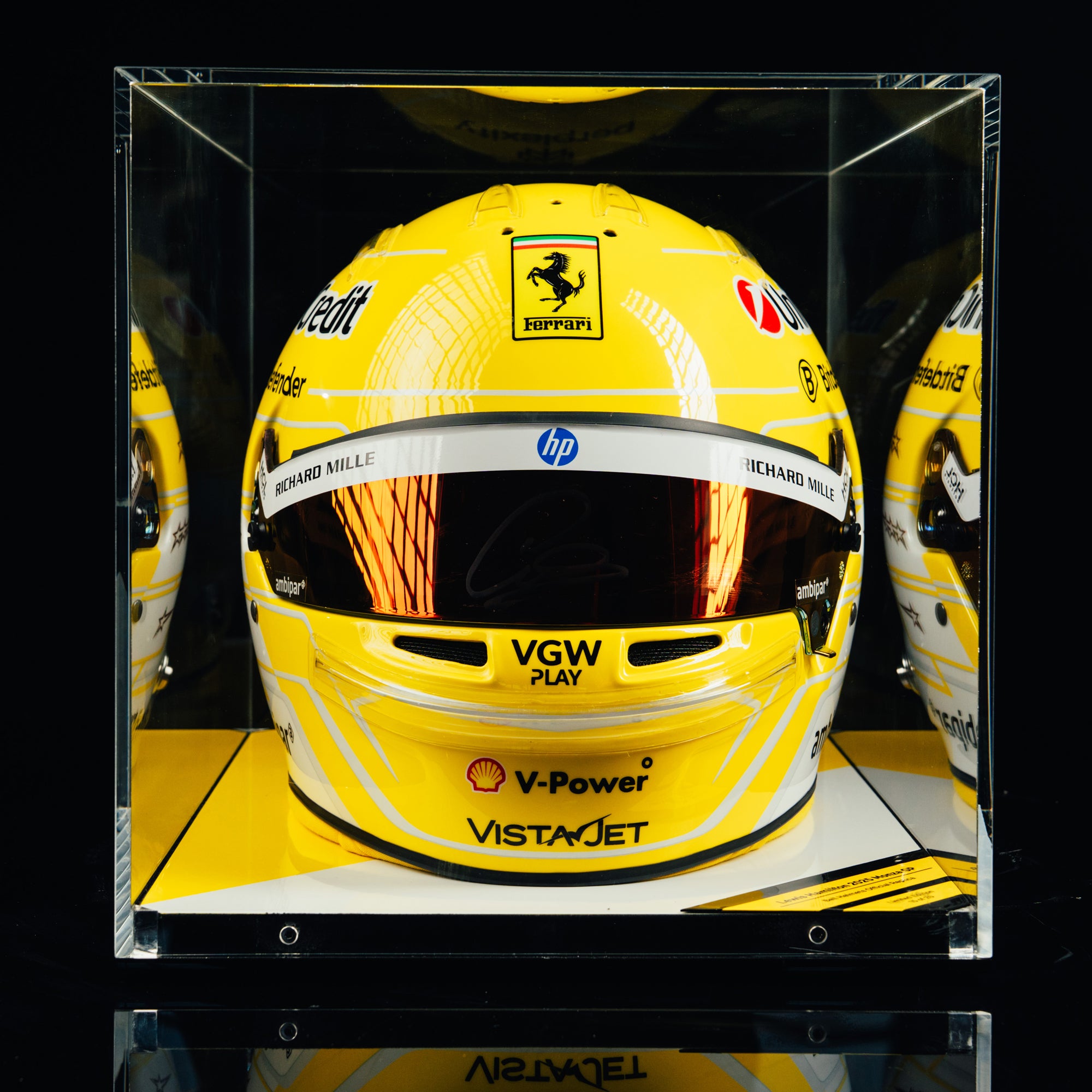 Each helmet has been personally signed by Lewis Hamilton, making it an exceptional collector’s piece that marks a truly historic moment — the joining of two global racing icons: Hamilton and Ferrari.