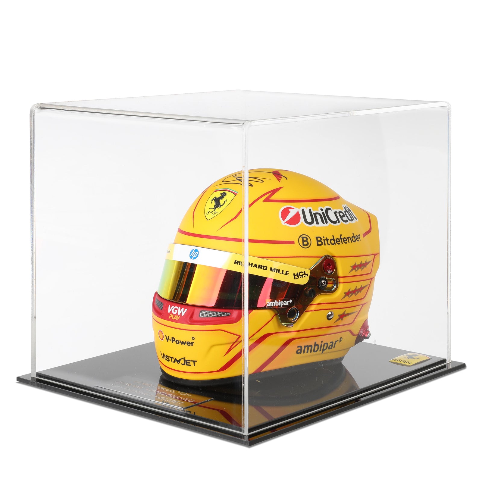This half scale helmet has been made using similar materials to the original and perfectly reflects his 2025 design. This mini lid will make your display stand out. Show your love for Sir Lewis Hamilton, with this signed edition. Signed pieces from Hamilton are highly sought-after and exclusive.
