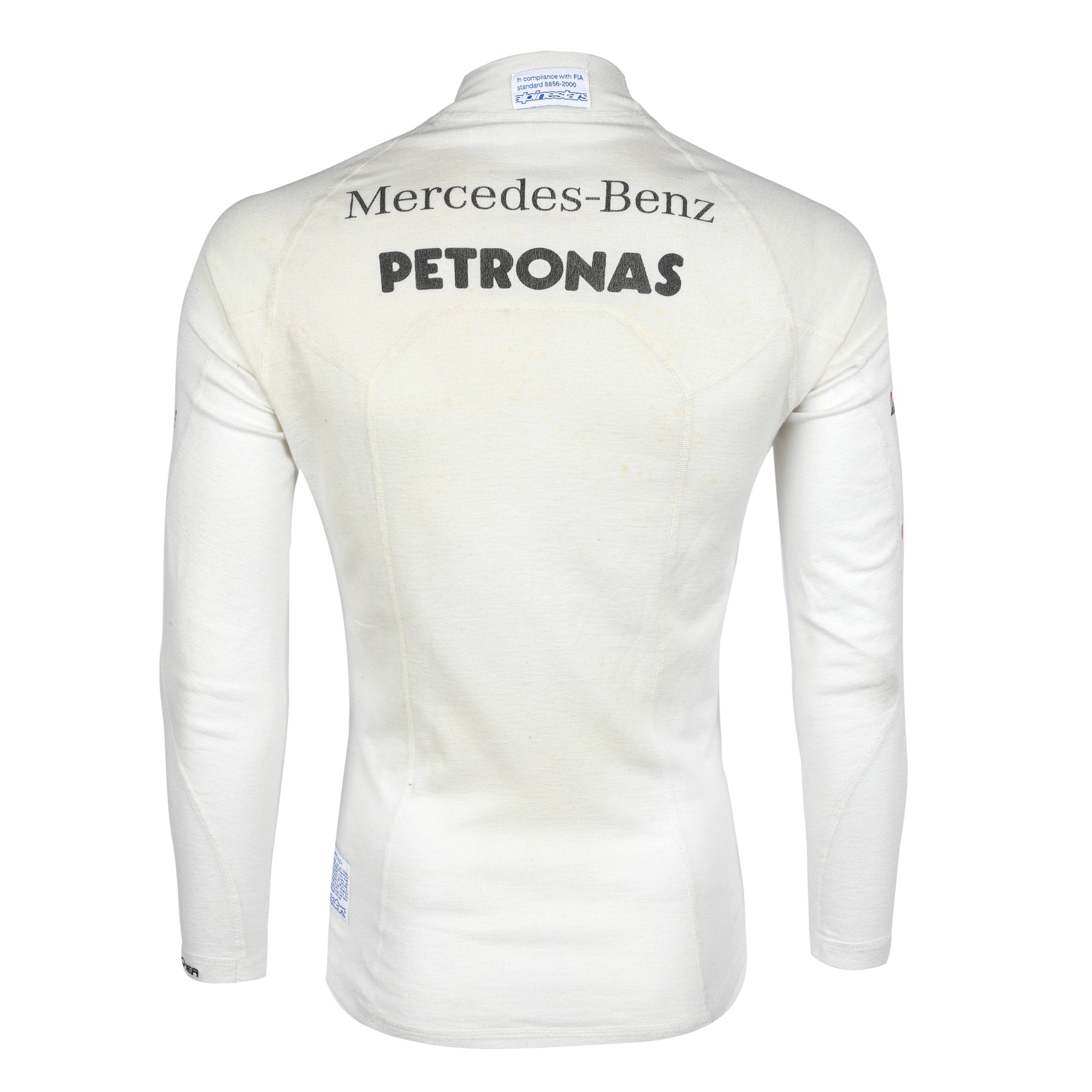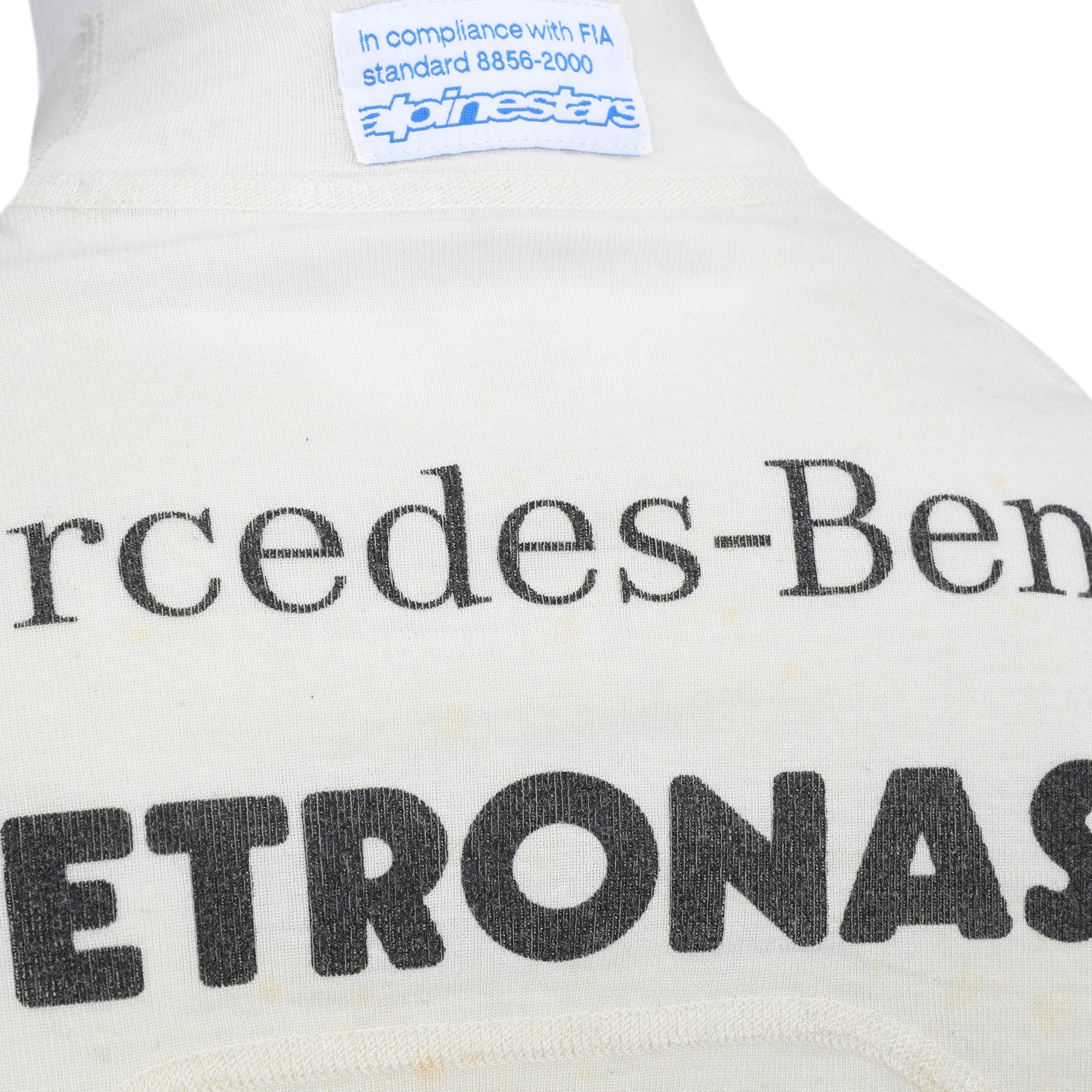 This authentic fireproof Nomex undershirt was worn by Schumacher during his first year with Mercedes Grand Prix, a pivotal campaign that marked his highly anticipated comeback to Formula 1 and the early foundations of Mercedes’ future dominance. Manufactured to exact FIA safety standards, the Nomex features Mercedes team branding and driver-specific detailing, and shows clear signs of Grand Prix use, offering a rare and intimate connection to Schumacher’s second F1 career.