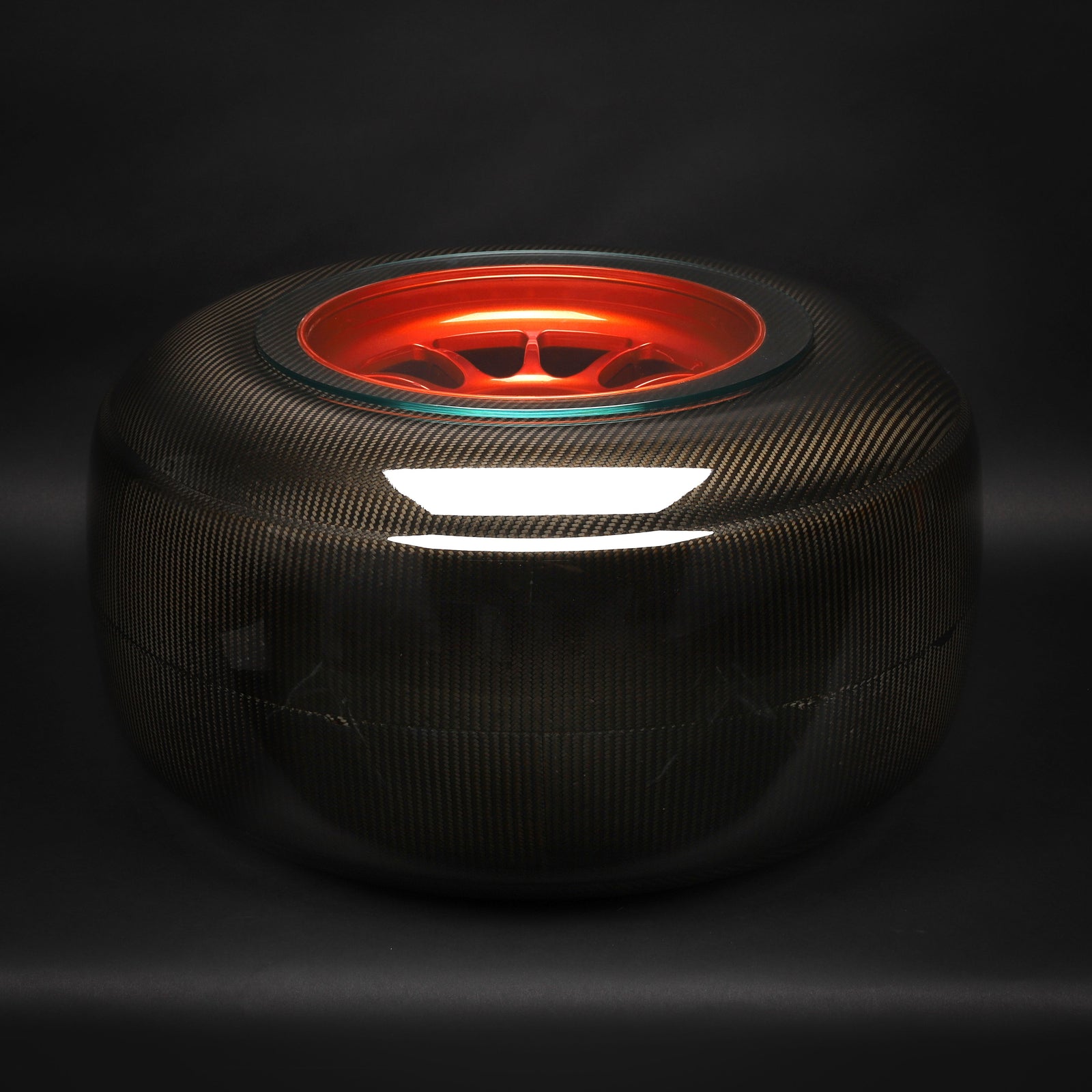 This is an exquisite and rather unusual table. From first glance it looks like a tyre; just like a slick used by the teams during races. However, with closer inspection you’ll find it’s not a tyre at all, but a carbon fibre construction, built to create this illusion. Although you’d never see a tyre like this on the track, it poses the question...what was it made for?
