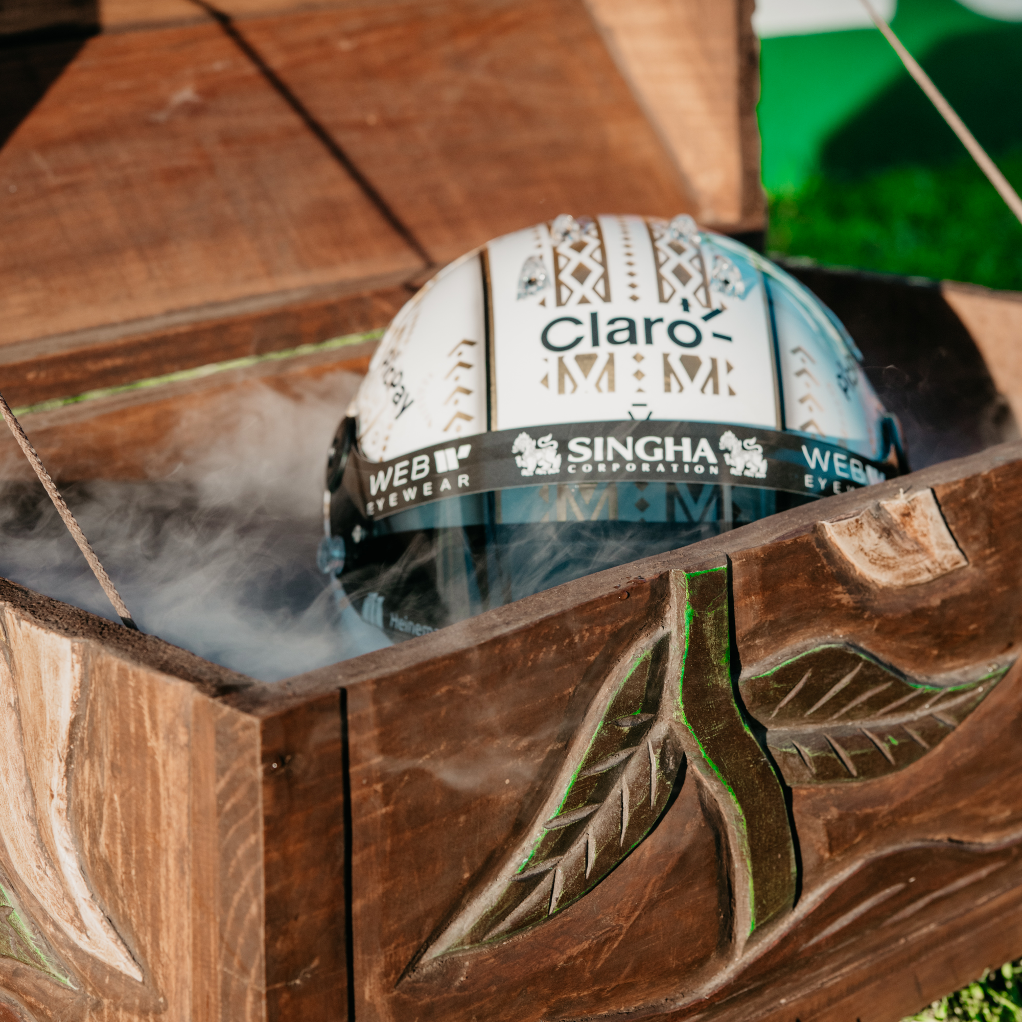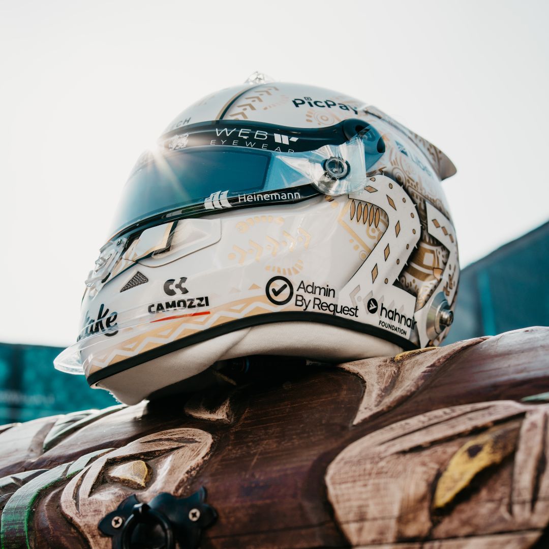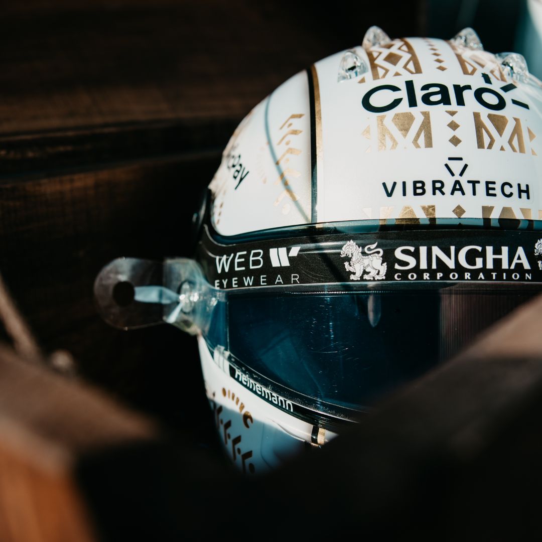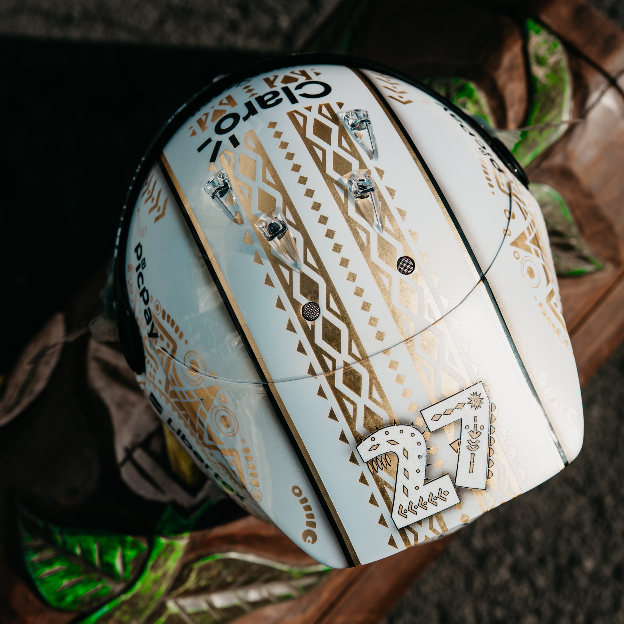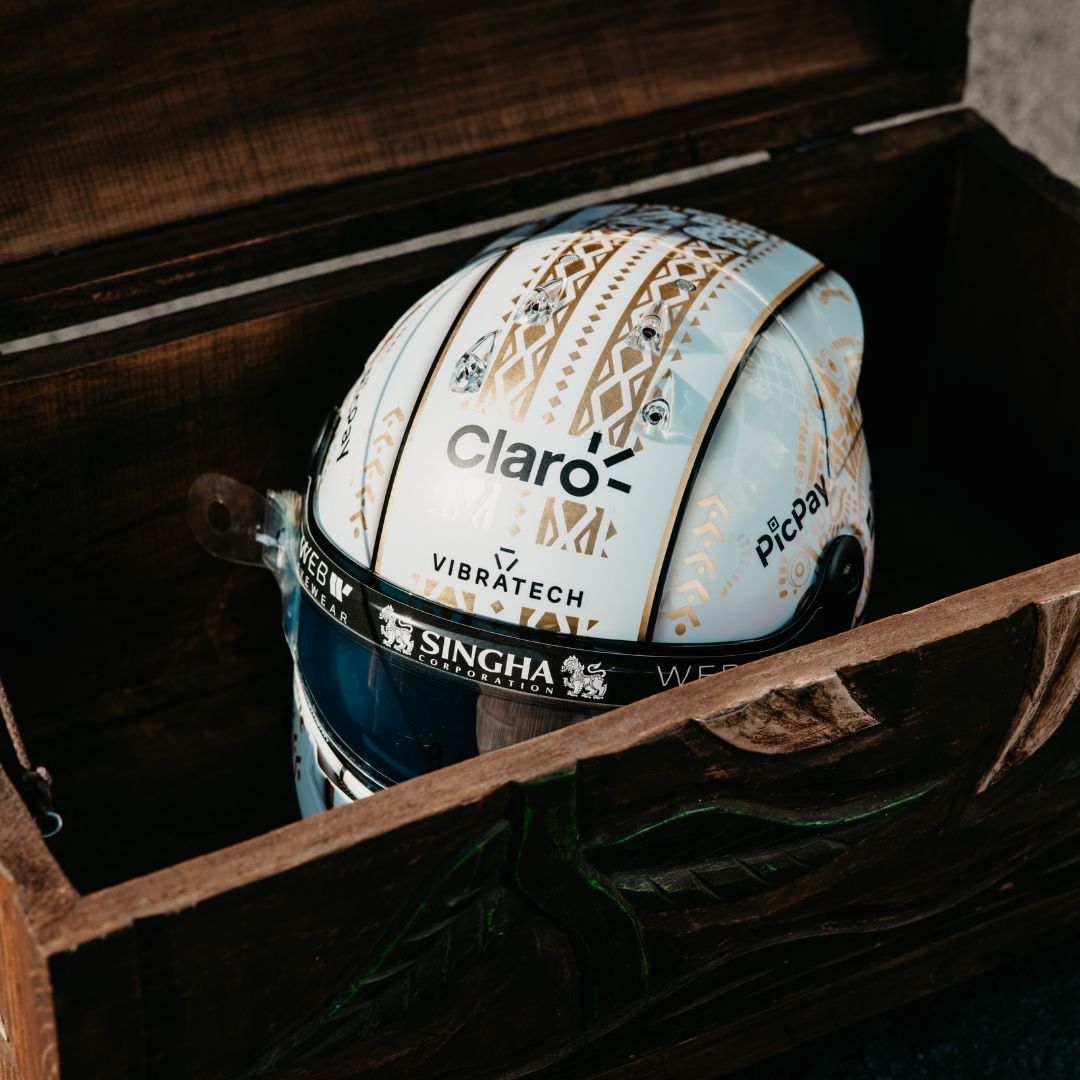 This helmet boasts a unique design, chosen for the Mexico City race. Featuring, the Piedra del Sol, Aztec Stone of the Sun, the gold leaf symbol set against a white base is truly a one-of-a-kind piece for a lucky collector to own. Those who watched the race, either at the Autódromo Hermanos Rodríguez or around the world, will have seen this very helmet in action.