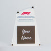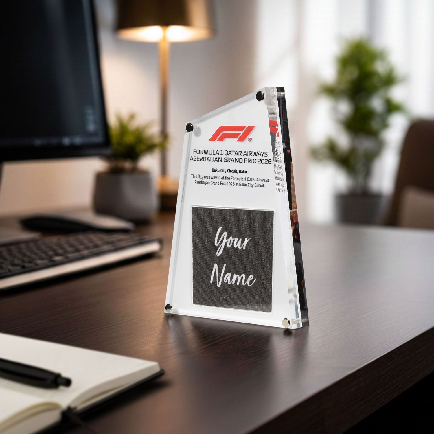 - We hand cut each square and present in new acrylic design, along with a photograph specific to race it was waved at taken by a professional F1 photographer
