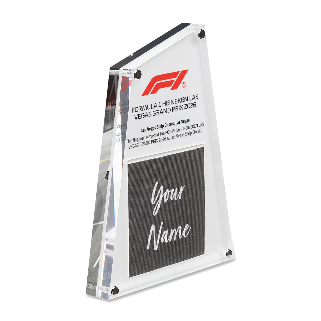- We hand cut each square and present in new acrylic design, along with a photograph specific to race it was waved at taken by a professional F1 photographer