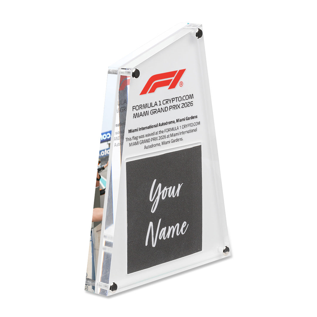 - We hand cut each square and present in new acrylic design, along with a photograph specific to race it was waved at taken by a professional F1 photographer