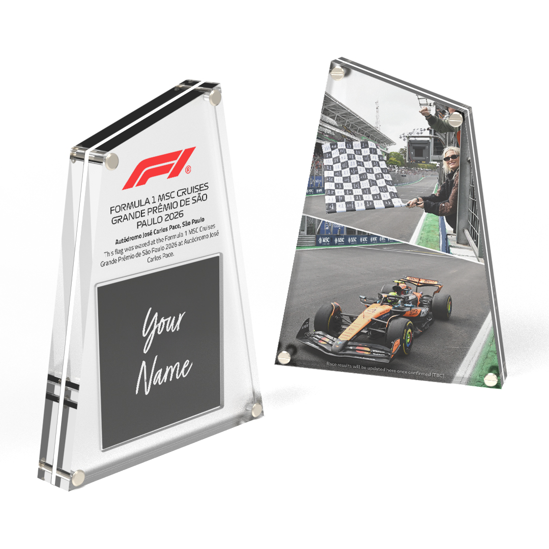 - We hand cut each square and present in new acrylic design, along with a photograph specific to race it was waved at taken by a professional F1 photographer