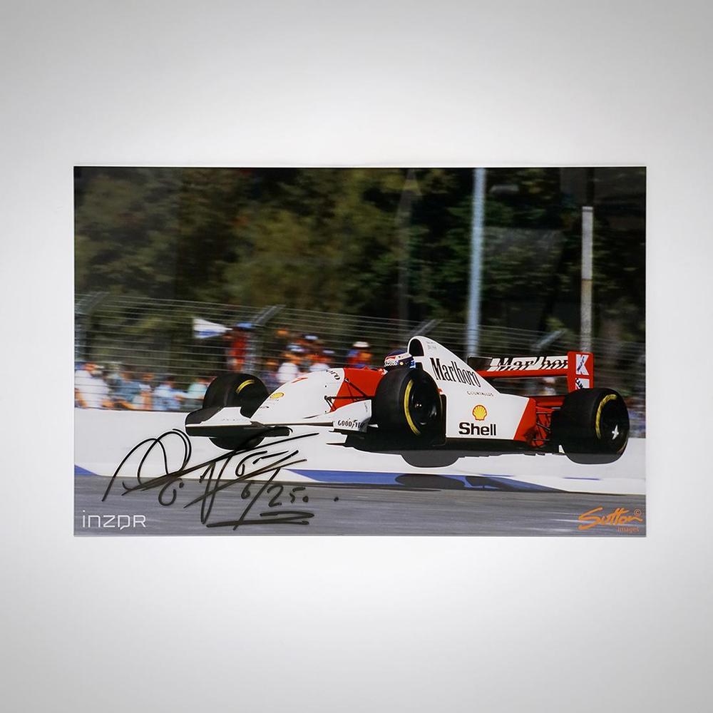 Honouring one of the sport’s most iconic images, this limited edition 40x60cm acrylic print features Mika Häkkinen airborne at the 1993 Australian Grand Prix - the moment that earned him the nickname The Flying Finn. Photographed by Mark Sutton, the piece includes Häkkinen’s original signature and comes with a concealed aluminium hanging mount, perfect for premium display.