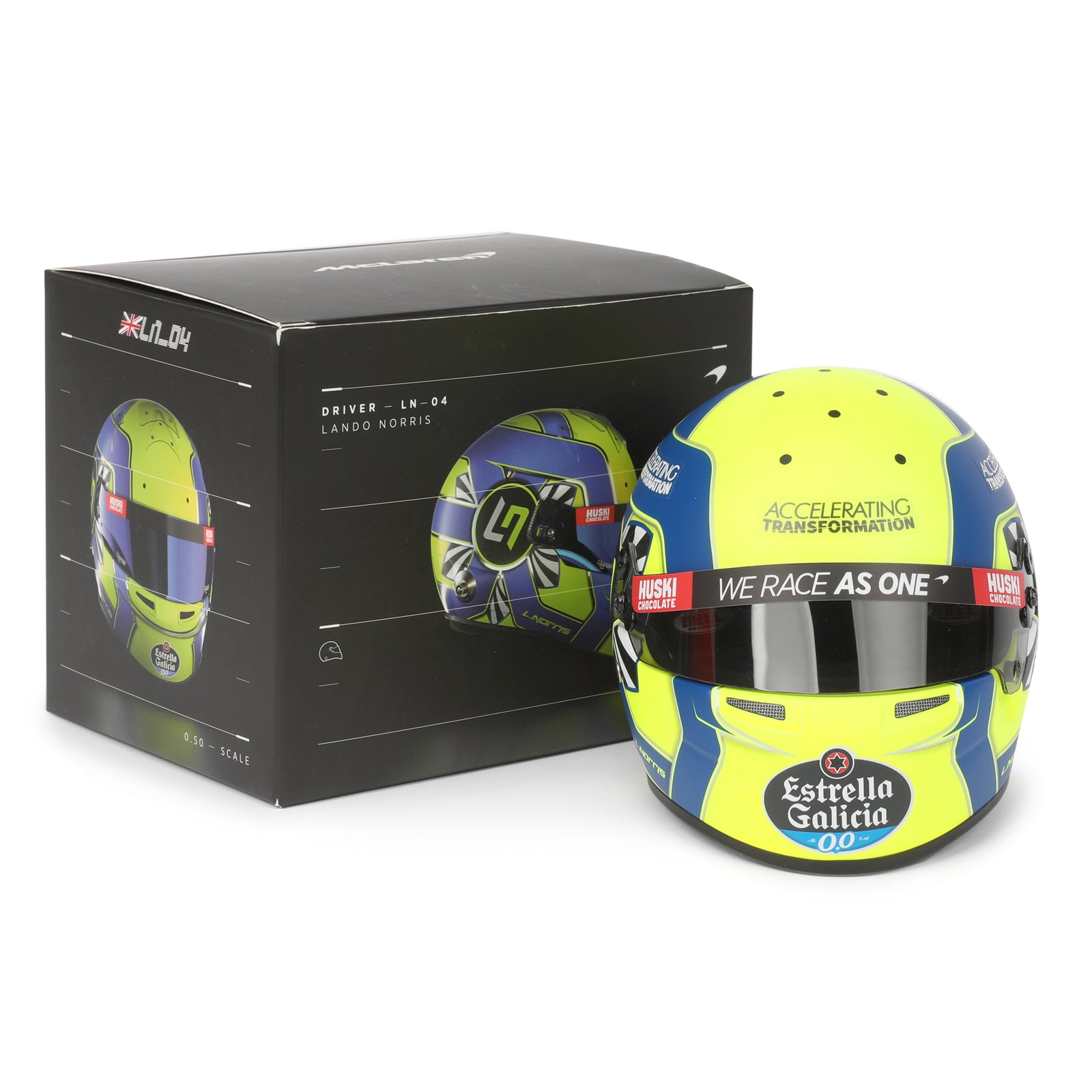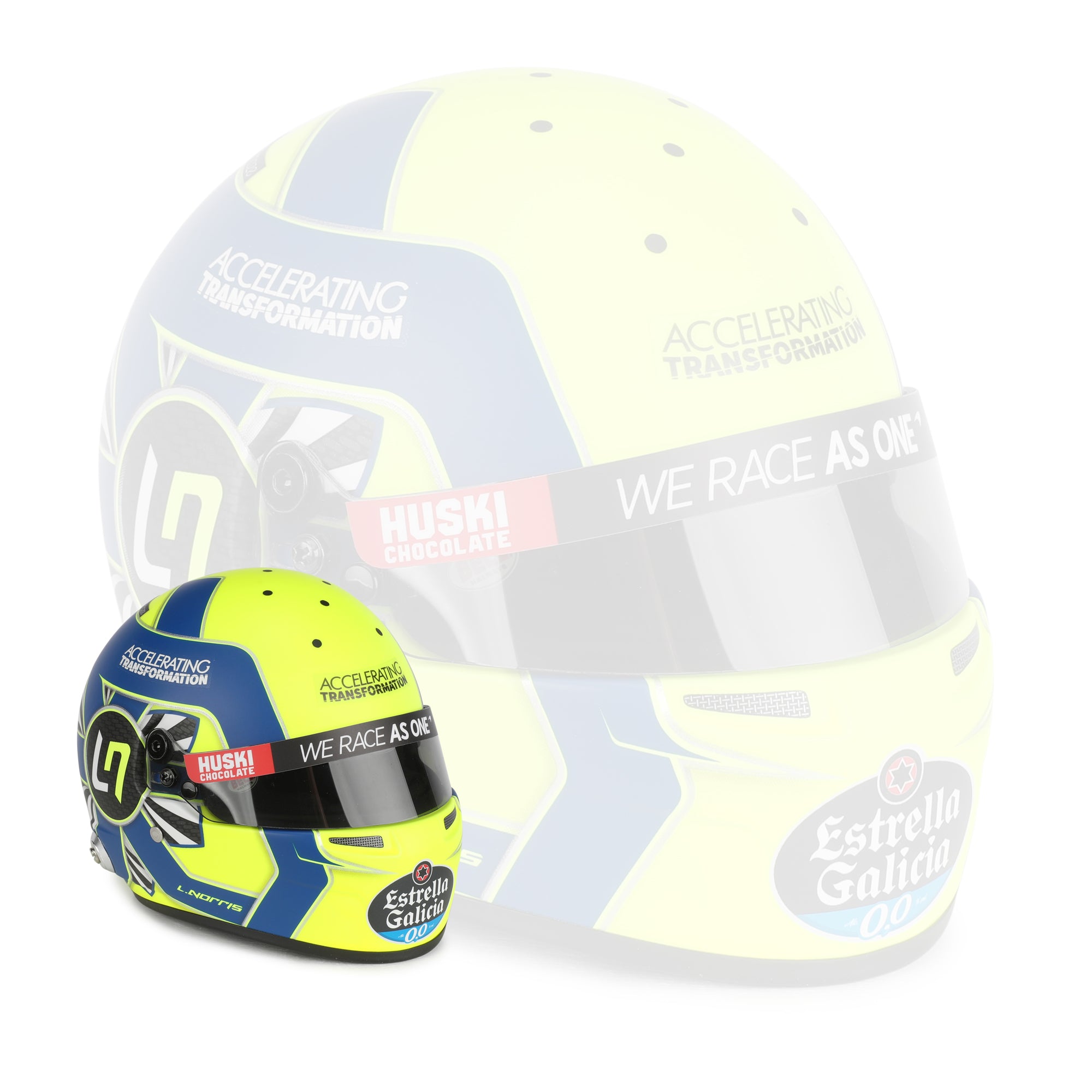• 1:2 scale replica mini helmet styled on Lando Norris’s 2020 F1 helmet design