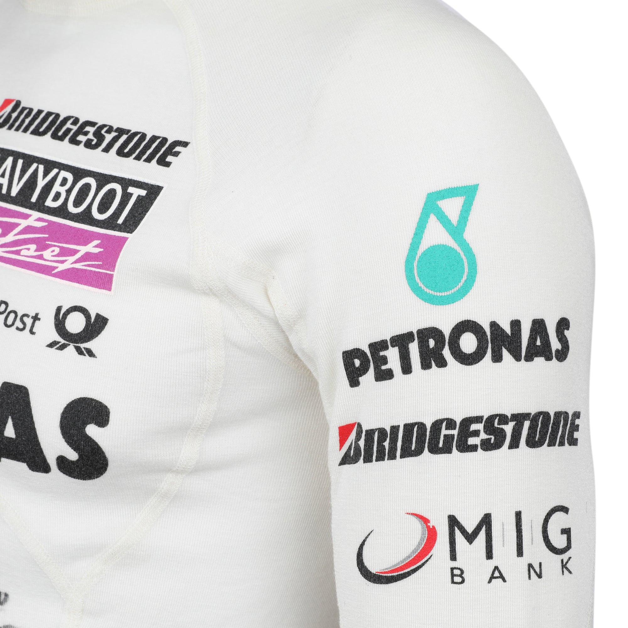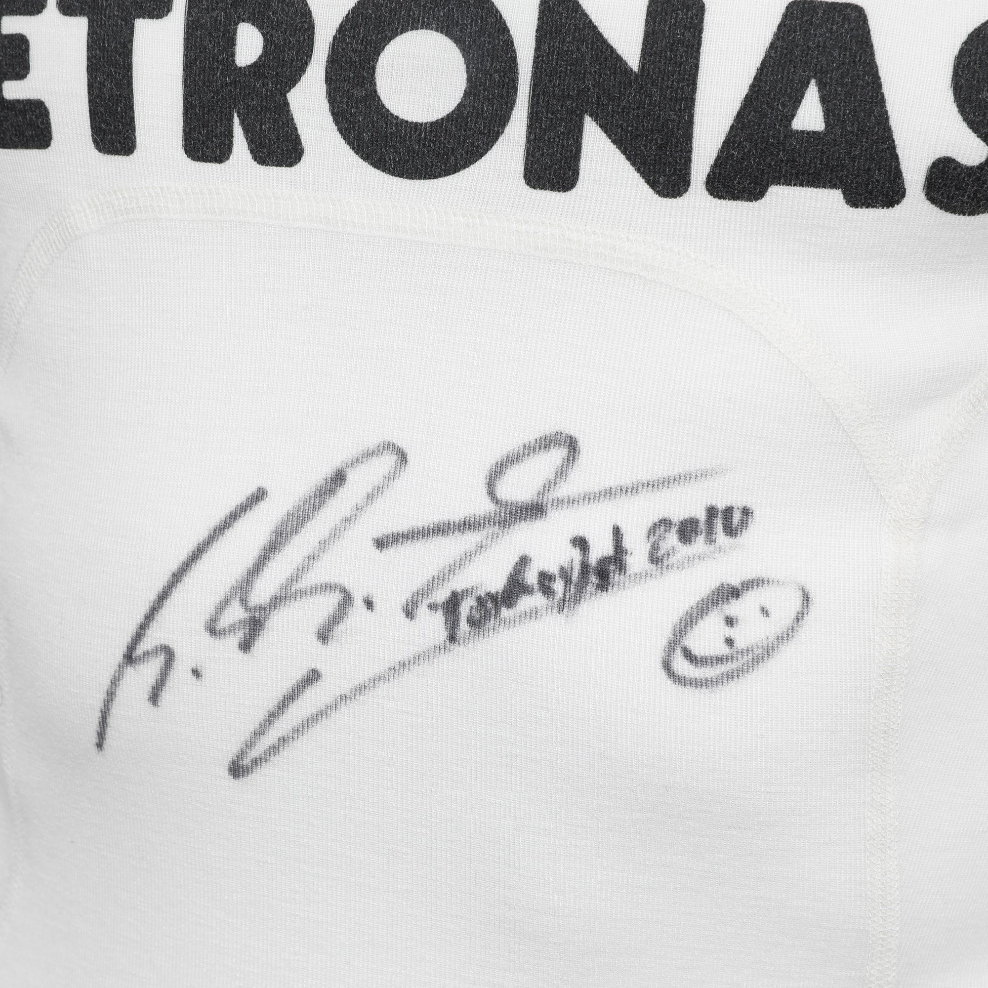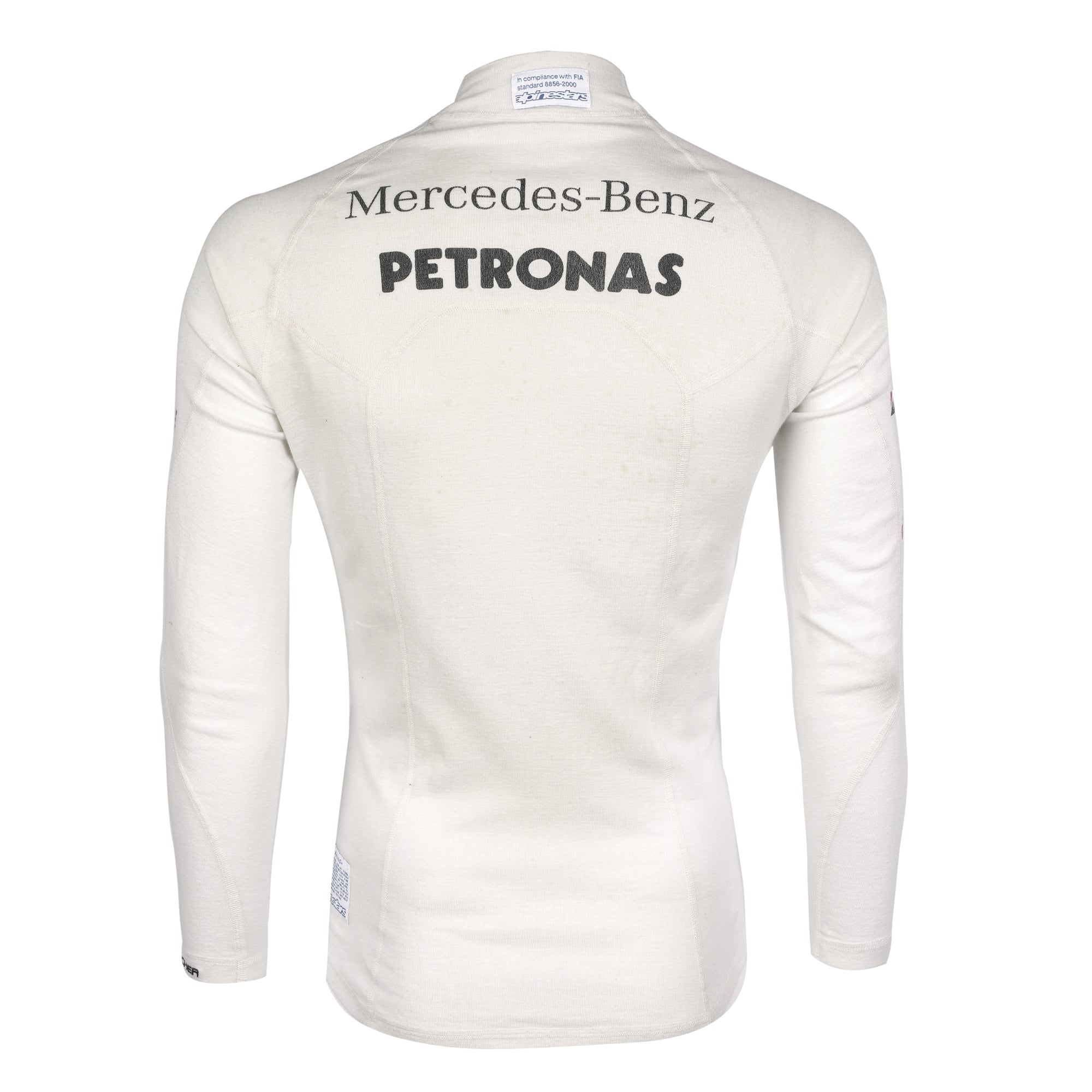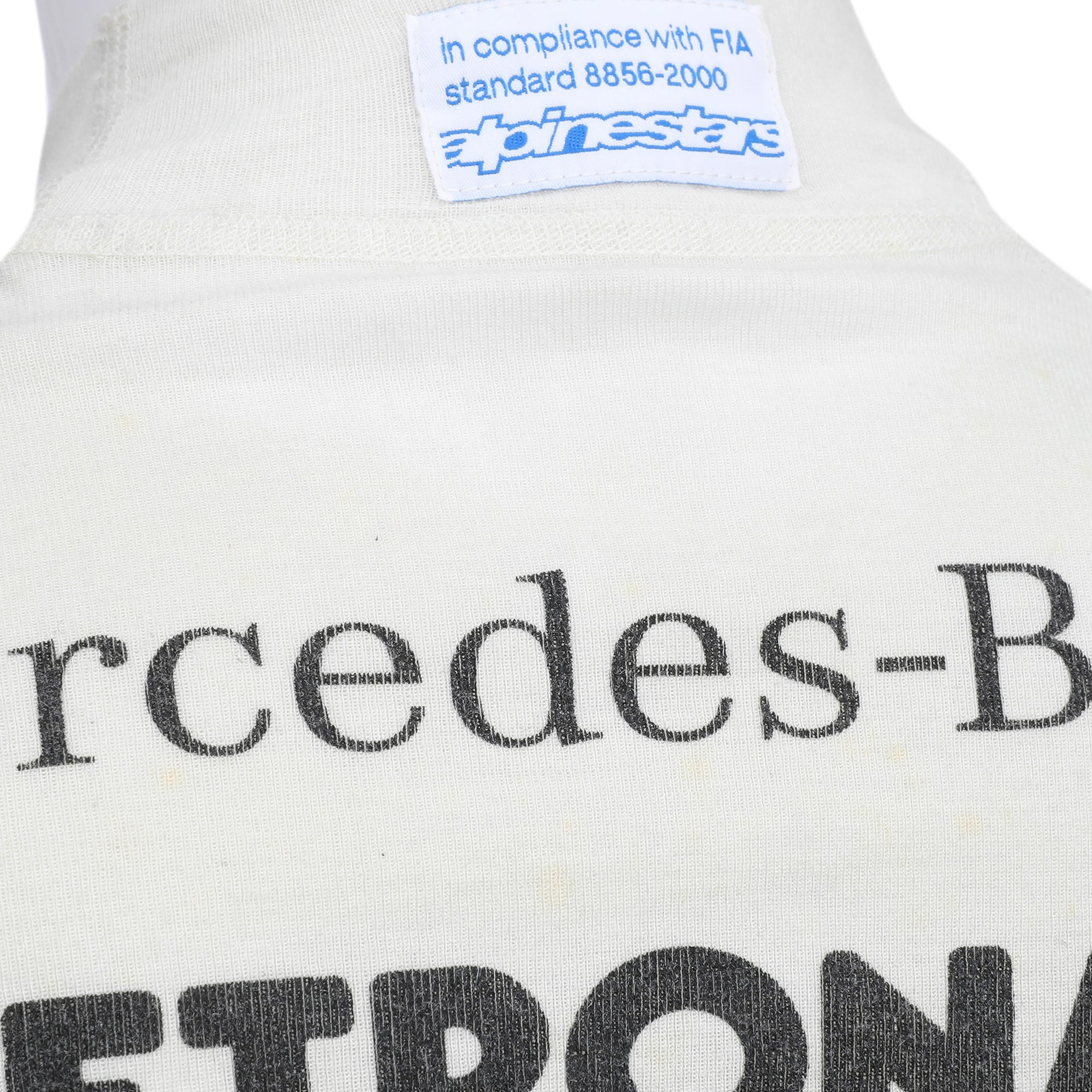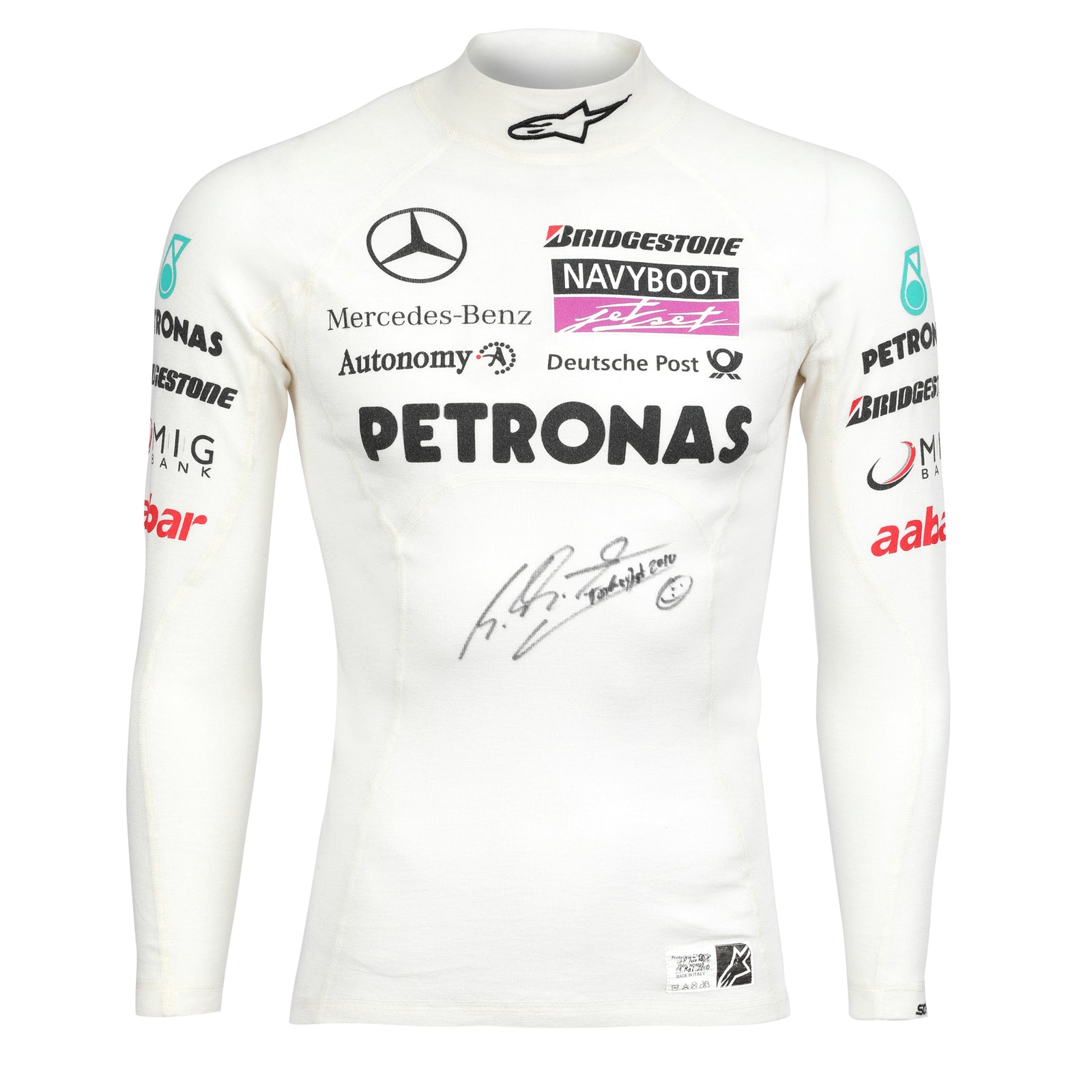 This authentic fireproof Nomex undershirt was worn by Schumacher during his inaugural year with Mercedes Grand Prix, a pivotal chapter that laid the foundations for one of the most dominant eras in F1 history. Produced to exact FIA safety specifications, the Nomex features Mercedes team branding, driver detailing, and shows clear signs of Grand Prix use, offering an intimate connection to Schumacher’s second Formula 1 career.