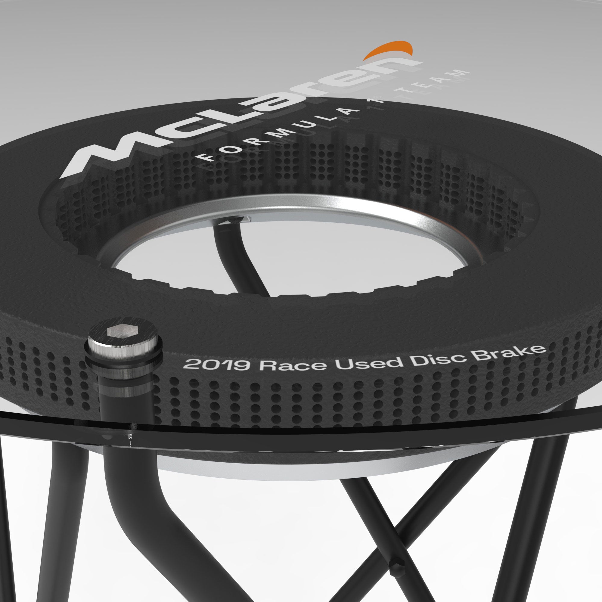 Bring the racing action of the F1 track into your home with this sleek table, crafted out of a race-used brake disc once used on the McLaren F1® cars seen on track in the landmark 2019 season