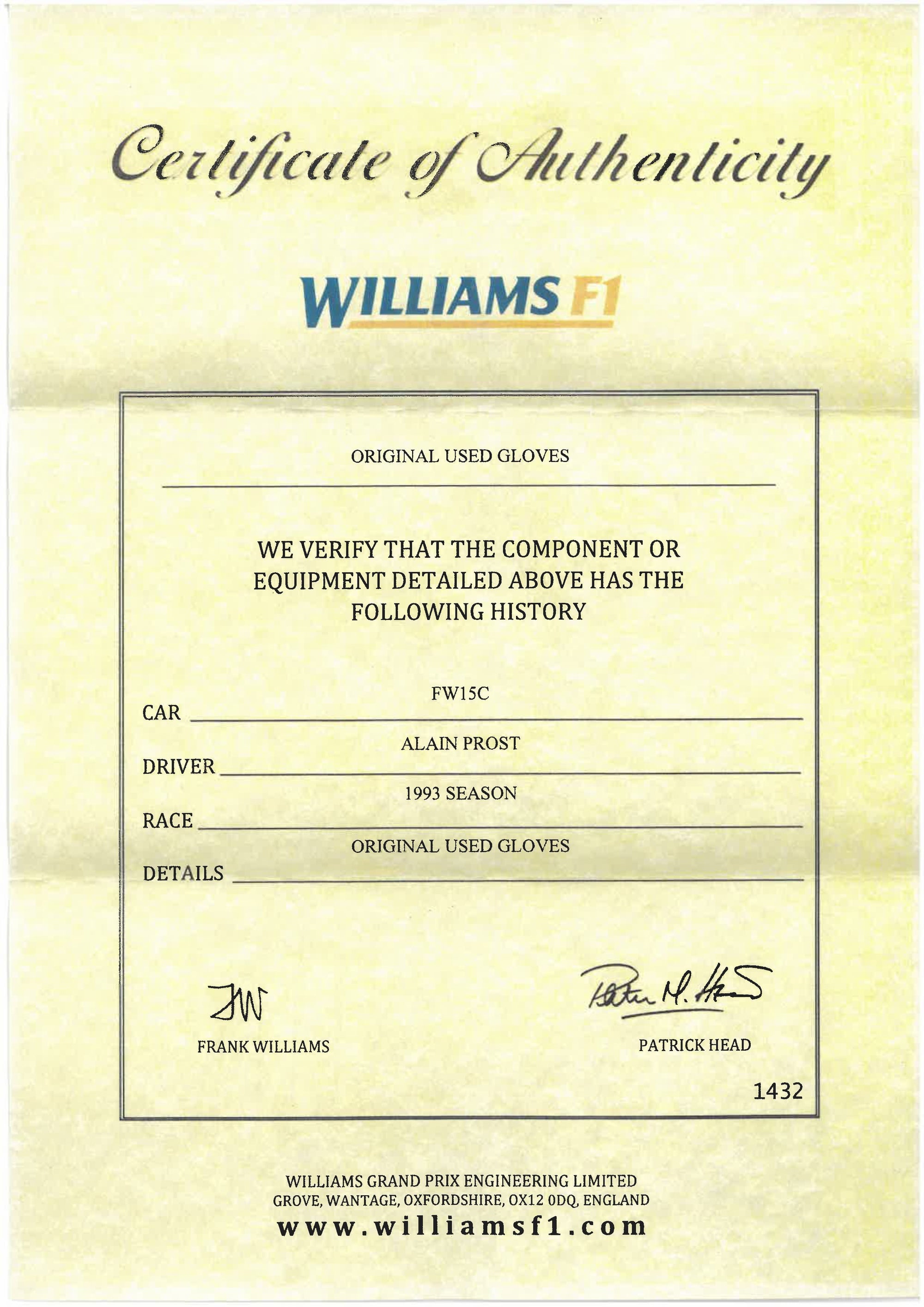 A compact yet exceptionally meaningful collector’s piece, these 1993 Williams gloves capture the precision, control and World Championship pedigree of Alain Prost at the pinnacle of Formula One.