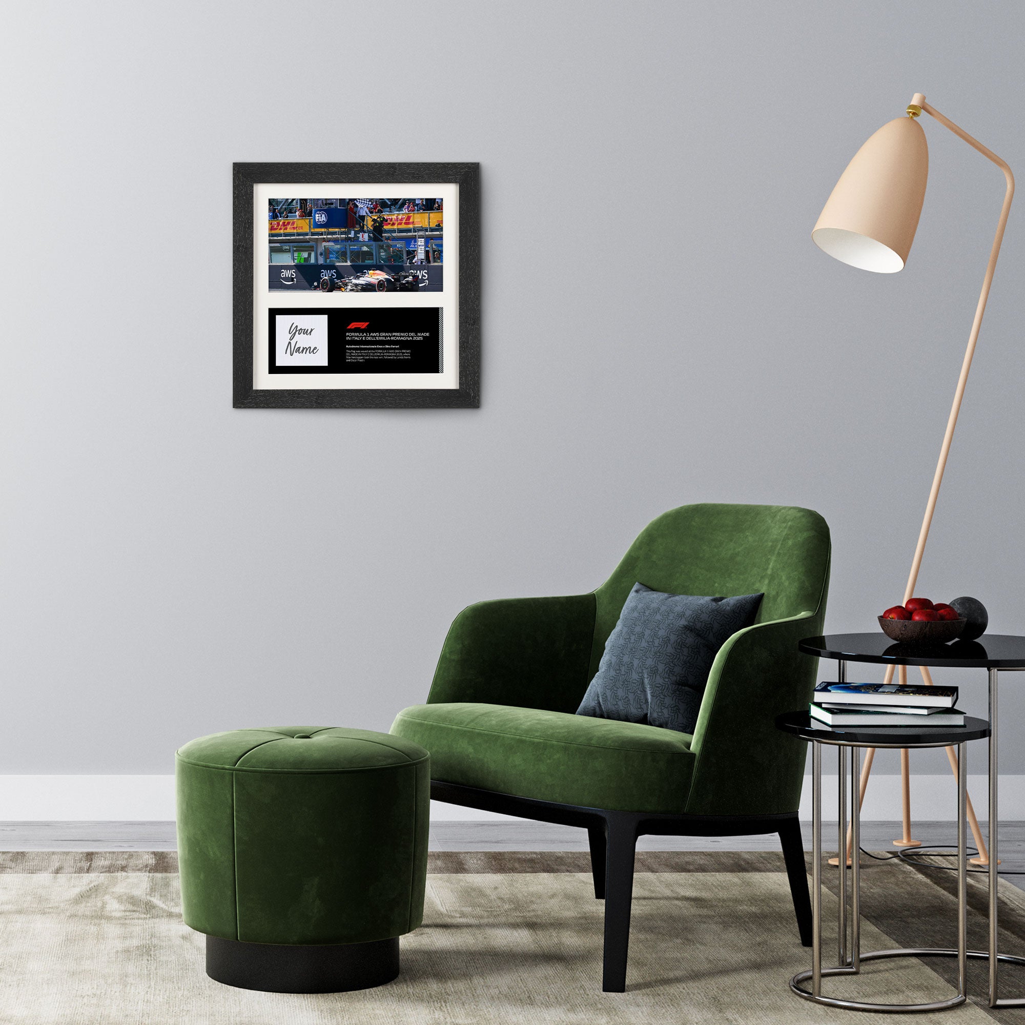 - We hand cut each square and professionally frame it, along with a photograph specific to race it was waved at taken by a professional F1 photographer