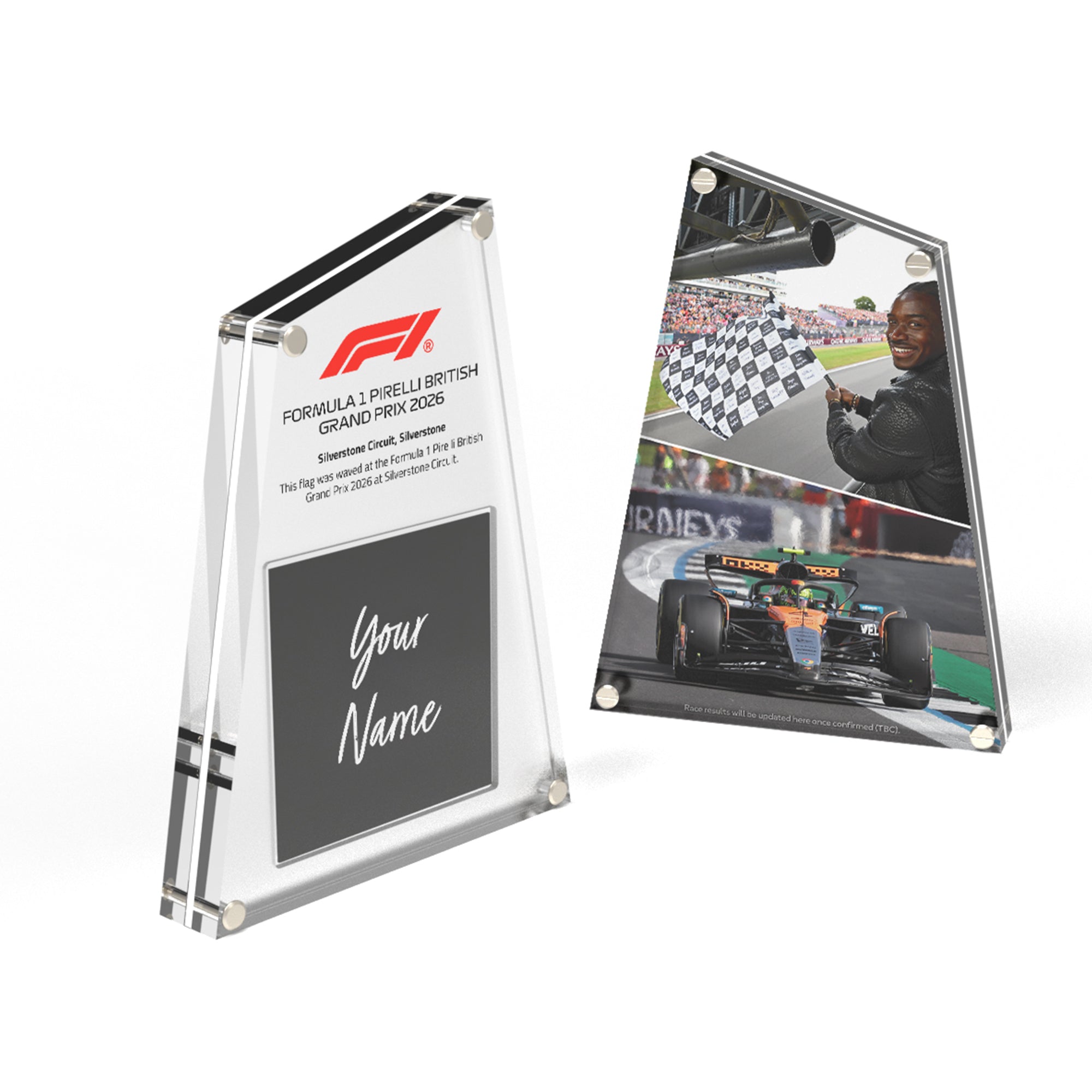 - We hand cut each square and present in new acrylic design, along with a photograph specific to race it was waved at taken by a professional F1 photographer