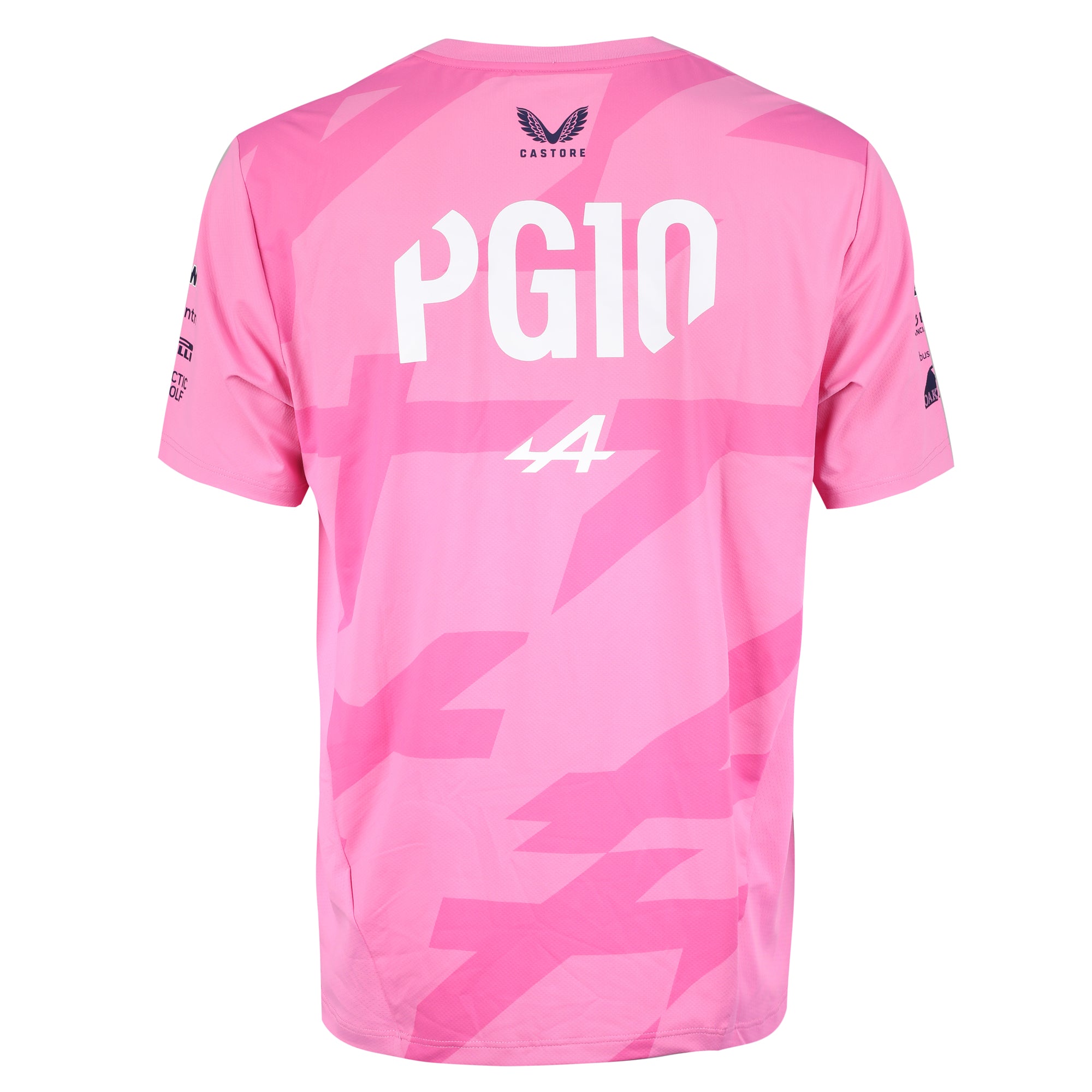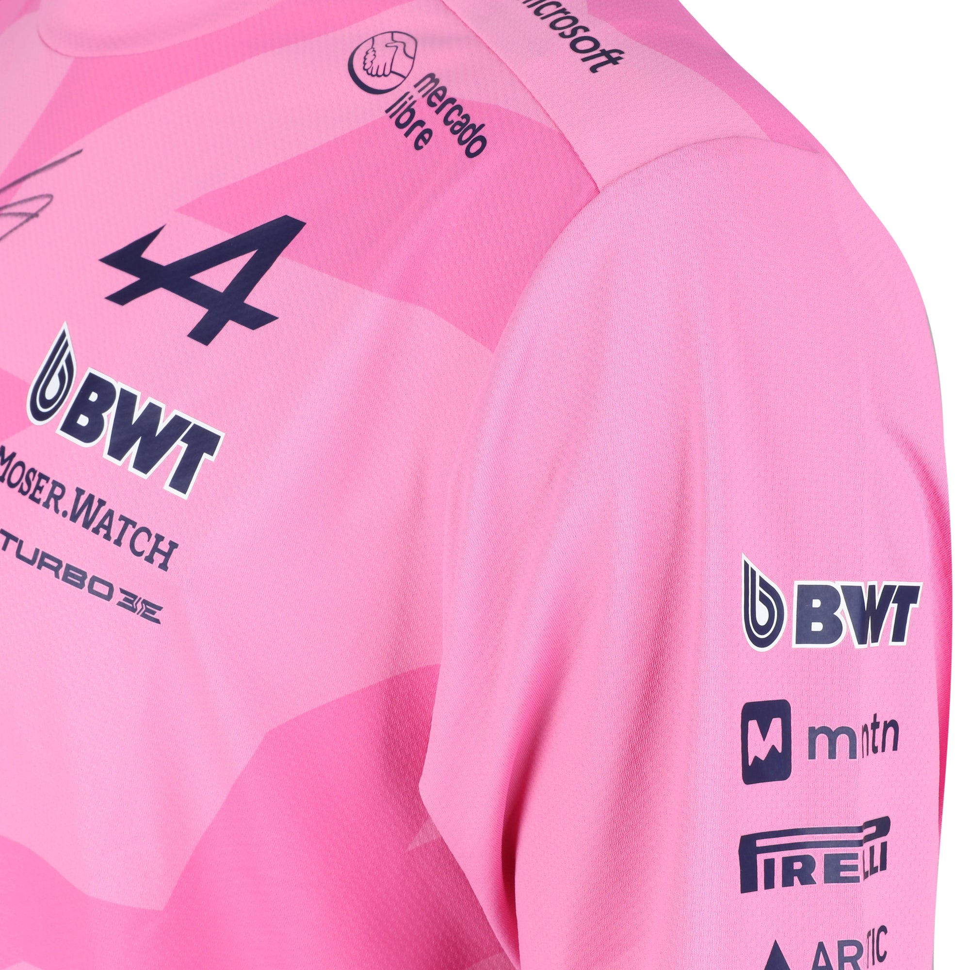 Boasting a pink design, this official 2025 T-shirt features vibrant details, proudly showcasing Alpine’s partnership with BWT. It is an officially licensed piece of team merchandise.