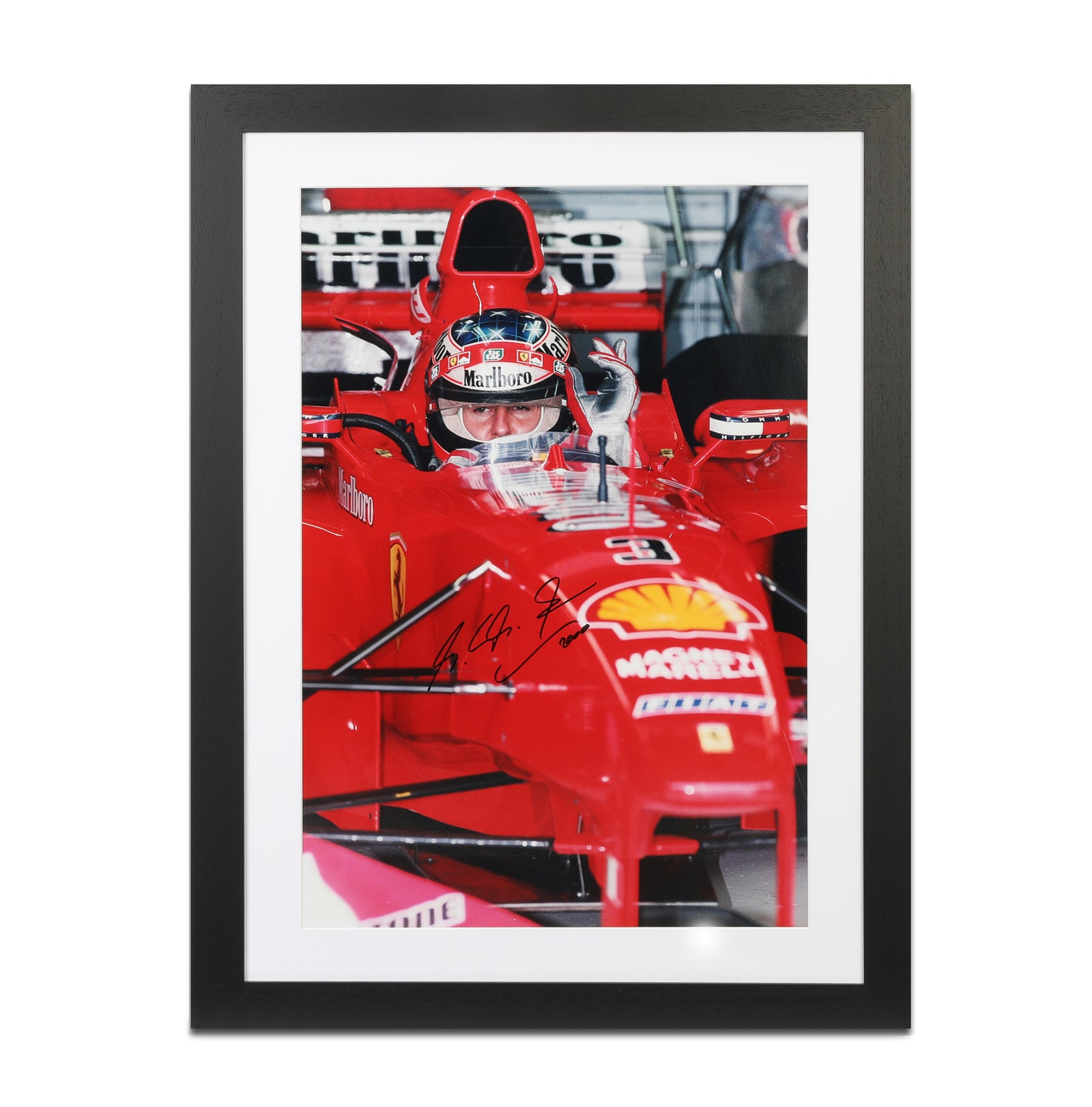 This striking image, taken during Ferrari’s Silverstone test in the 2000 season, has been professionally framed and signed by Schumacher, making it a superb display piece celebrating one of Formula One’s most successful partnerships.