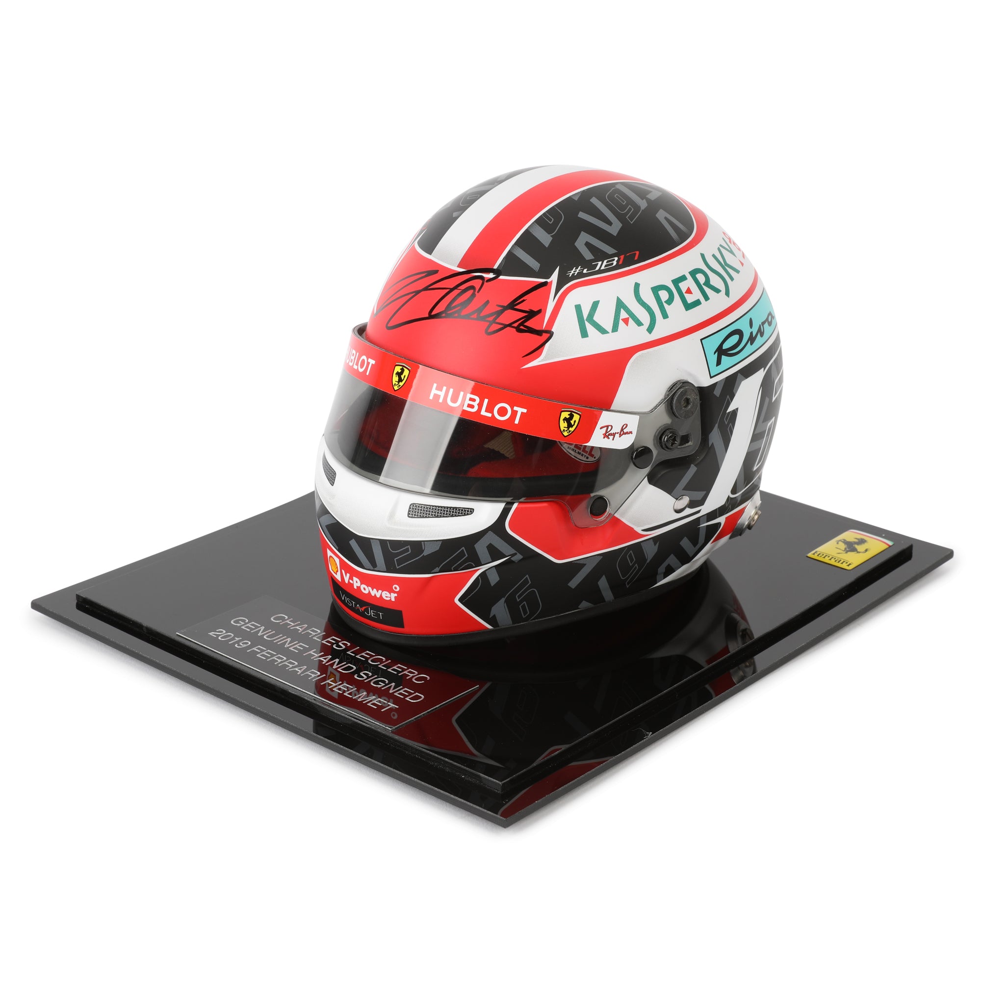 Charles Leclerc's 2019 season mini helmet, meticulously crafted at 1:2 scale and personally signed by the Ferrari driver.