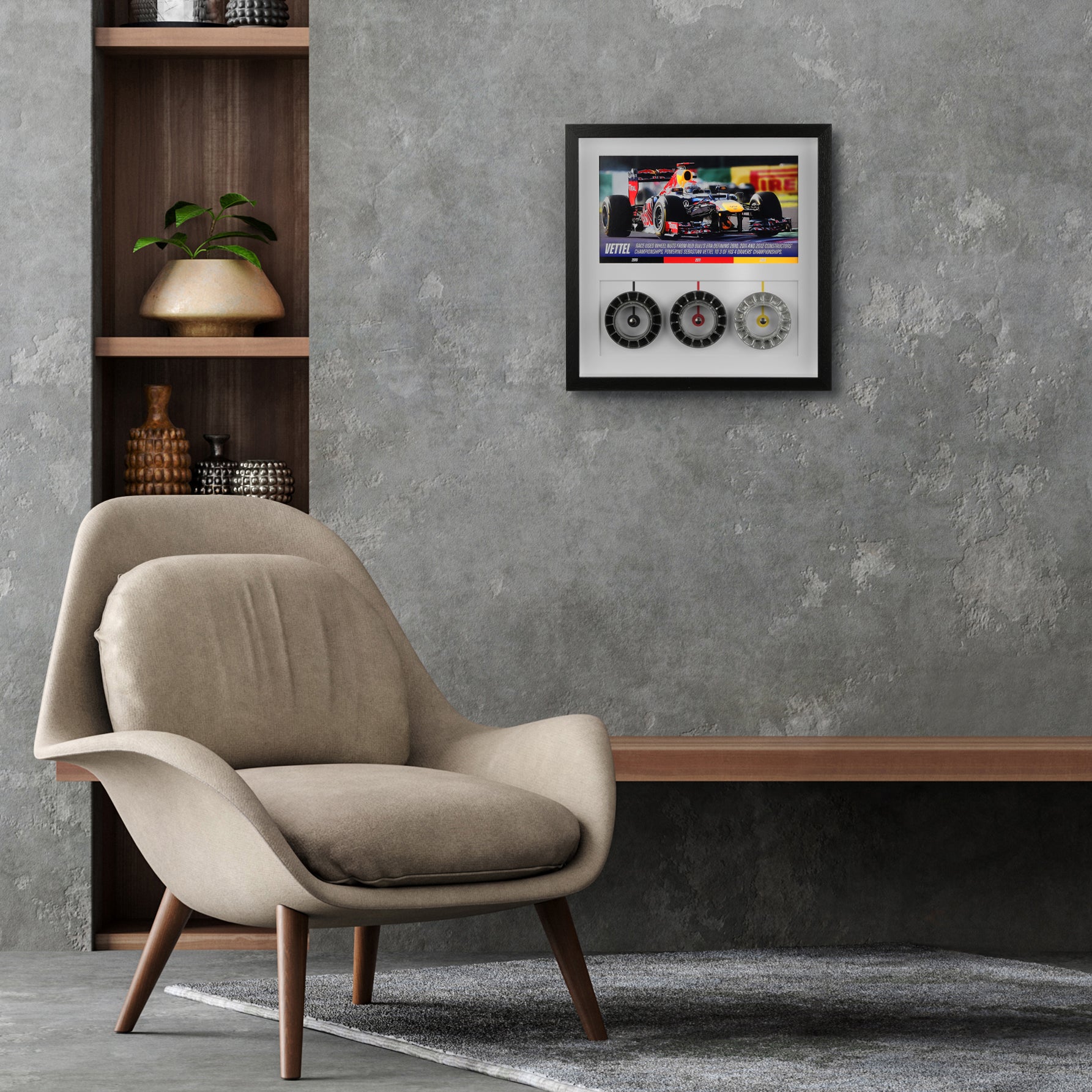 The framed display includes a photograph capturing the German World Champion out on track, accompanied by three wheel nuts, taken from his RB6, RB7 and RB8 cars, driven to victory in 2010-2012.